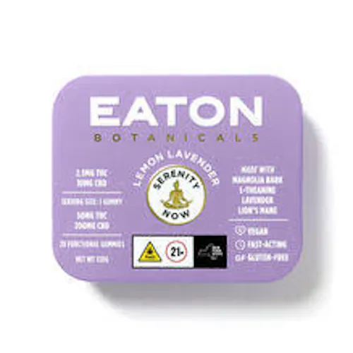 Eaton Botanicals' Lemon Lavender "Serenity Now" is a low-dose, vegan gummy designed for calm and mental clarity, featuring a 1:4 ratio of THC to CBD (2.5 mg THC and 10mg CBD per gummy). It is infused with functional ingredients like Lion's Mane mushroom, L-theanine, and magnesium to support relaxation, balance, and mental focus. The flavor comes from real lemon and lavender purées, making it a balanced and refreshing edible.